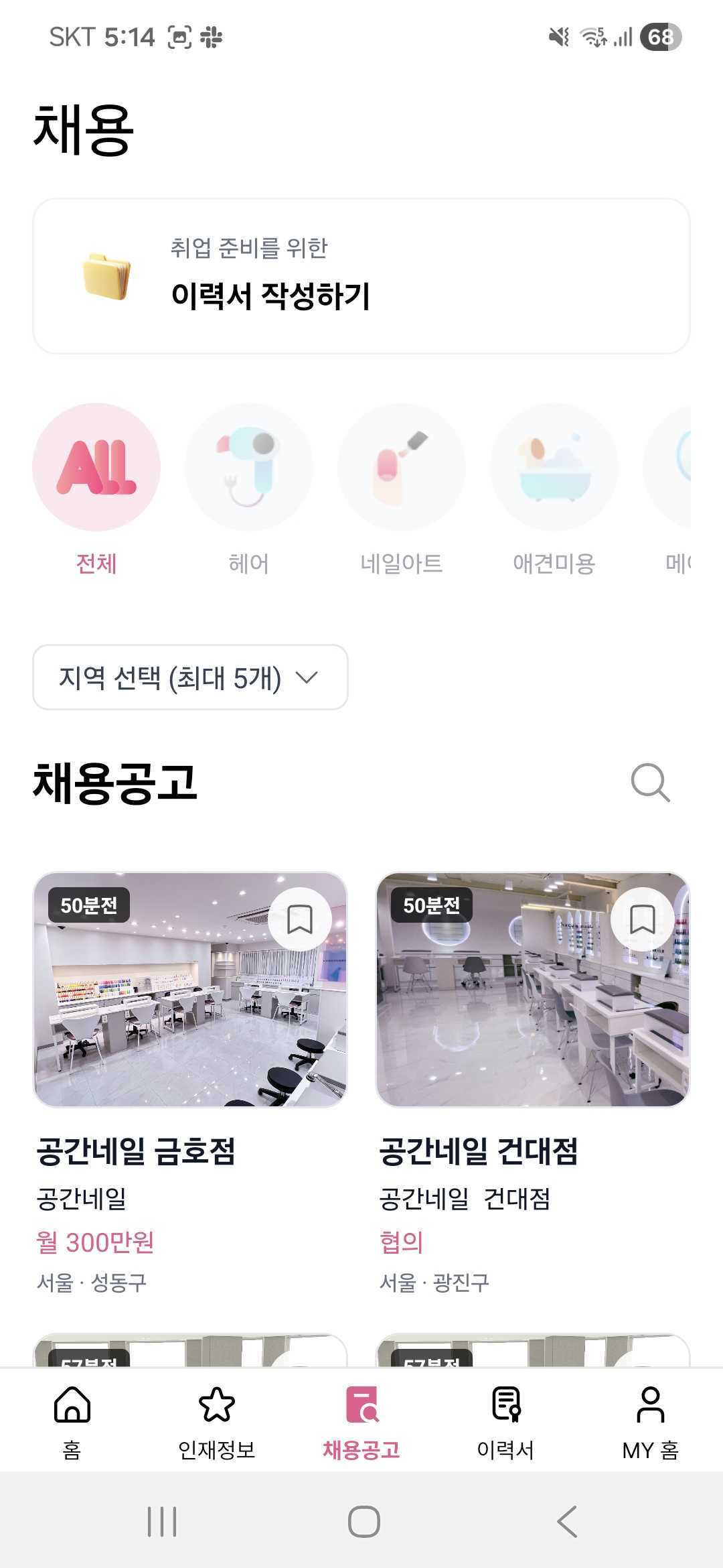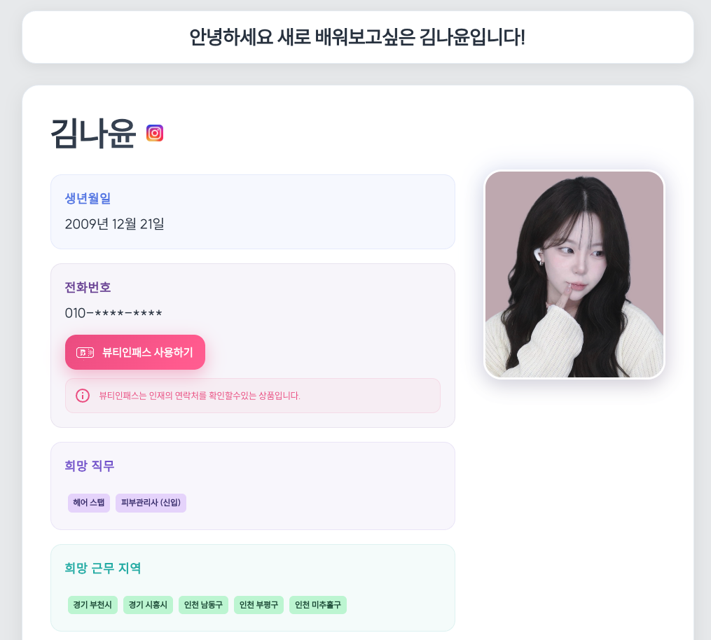 미용업계 전문 구인구직 및 프리랜서 매칭 플랫폼. 헤어, 네일, 피부관리 등 미용 분야의 구인·구직자를 연결하는 올인원 채용 서비스입니다. 이력서 작성·관리, 브랜드(매장) 프로필, 채용공고 등록, 부트페이 결제, 카카오 알림톡, 푸시 알림까지 — 웹(Next.js)과 모바일 앱(React Native)을 동시에 풀스택으로 구축했습니다.